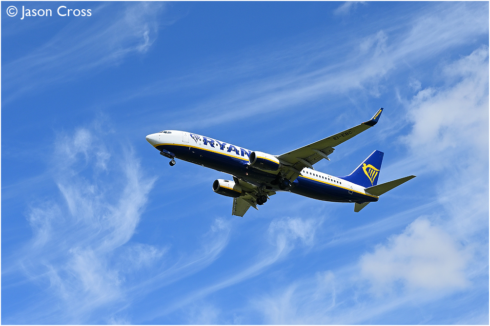 Ryanair Boeing 737 EI-EBC approaches East Midlands Airport with flight FR4469 from Malaga. Date: 12 July 2020 Manipulation Notes: None