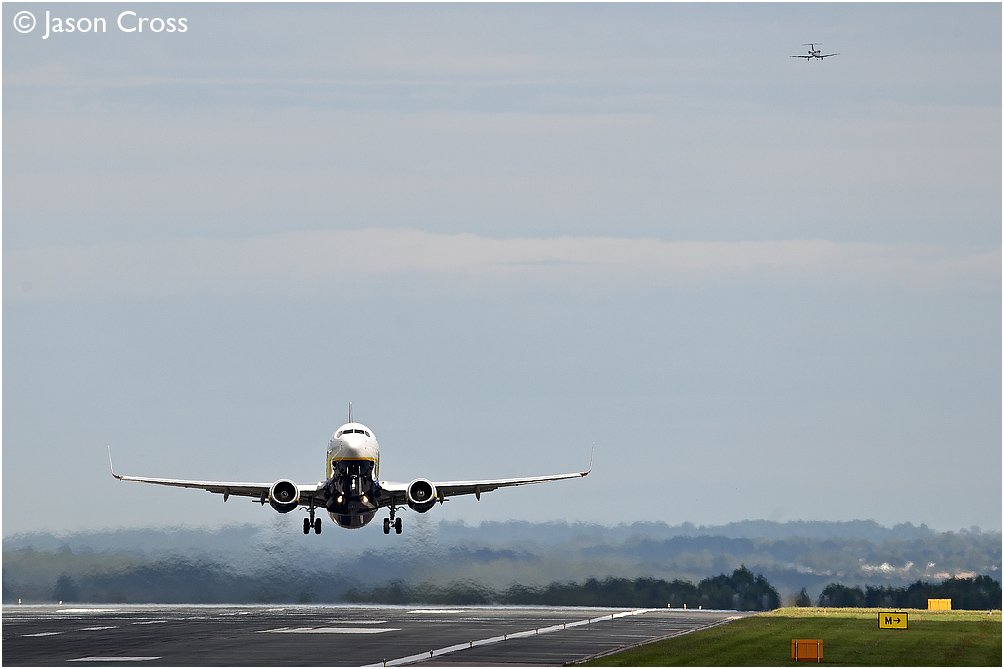 Ryanair Boeing 737, EI-EMA takes off from East Midlands Airport with flight FR6601 1710 East Midlands Airport to Palma de Mallorca as a smaller jet approaches in the distance. Date: 4 August 2020 Manipulation Notes: None