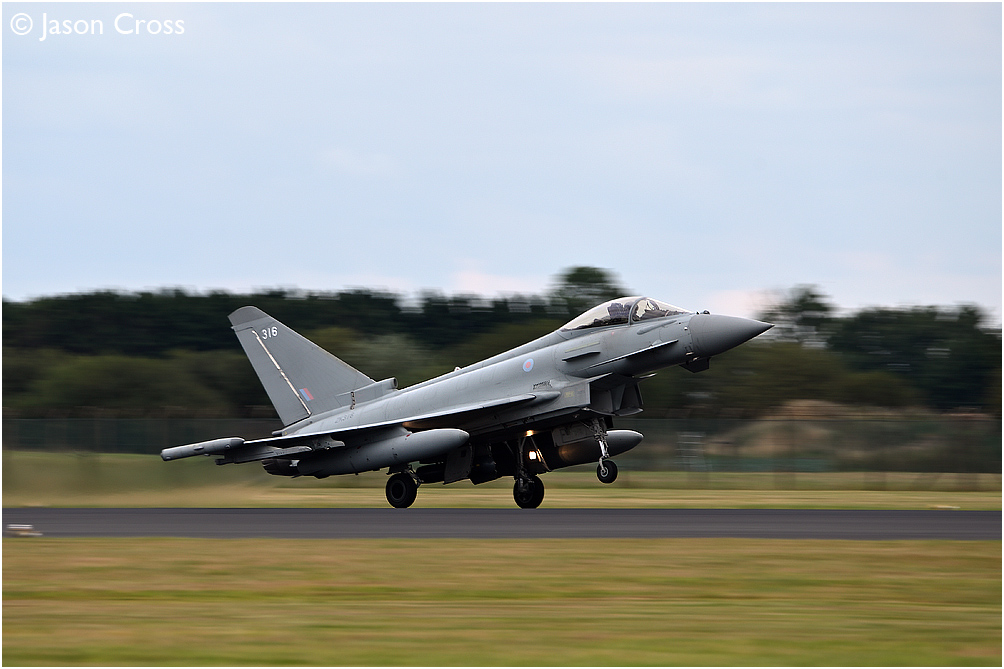 A pan shot of Eurofighter Typhoon ZK316 touching down at RAF Coningsby. Date: 6 August 2020 Manipulation Notes: None