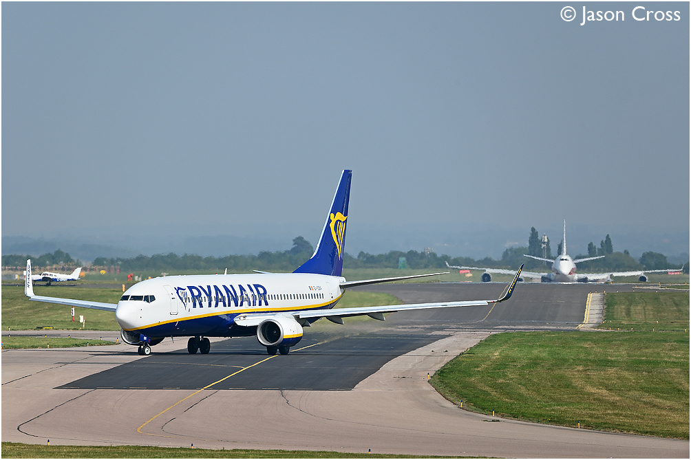 East Midlands Airport. Ryanair Boeing 737 EI-EBX taxies out with a flight for Faro while Kalitta Air Boeing 747 N745CK can be seen taxiing in with flight K4996 from Brussels. Date: 11 August 2020 Manipulation Notes: None
