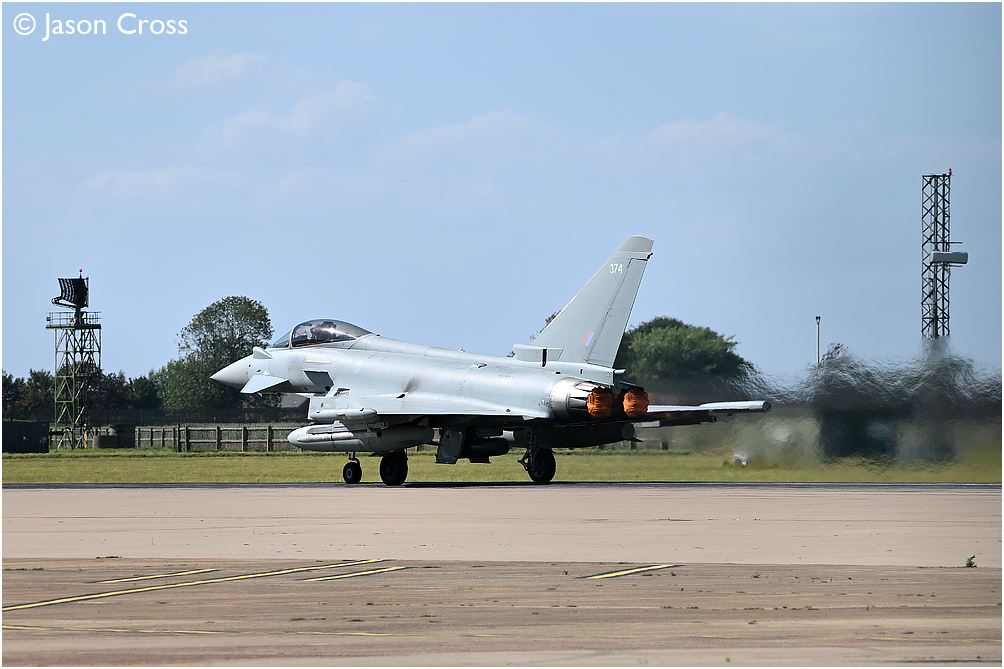 Eurofighter Typhoon ZK374 doing a performance (afterburner) take off at RAF Coningsby. Date: 20 August 2020 Manipulation Notes: None