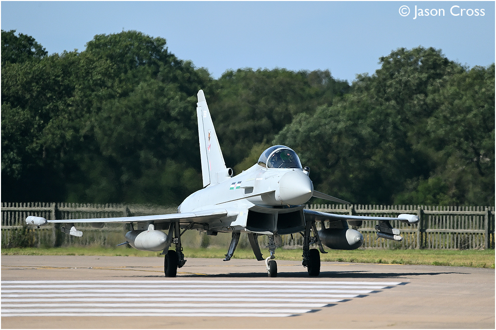 Eurofighter Typhoon ZK366 taxies onto runway 25 at RAF Coningsby. Date: 20 August 2020 Manipulation Notes: None