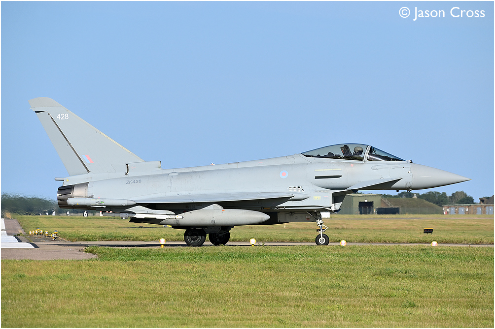 Eurofighter Typhoon ZK428 taxiing in after landing at RAF Coningsby. Date: 20 August 2020 Manipulation Notes: None