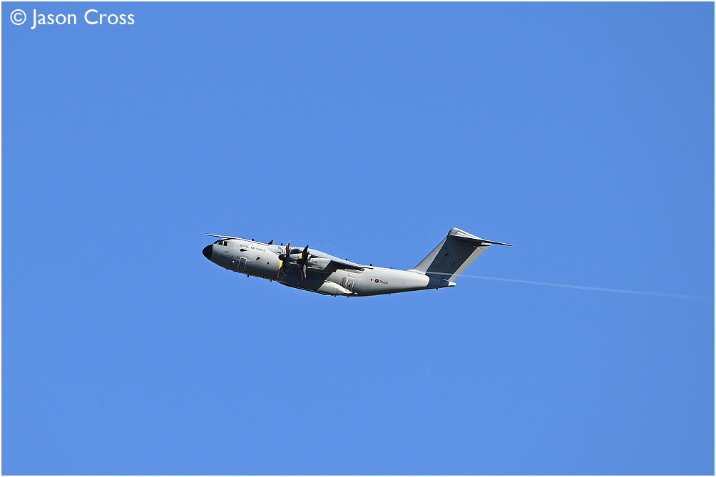 Airbus A400M Atlas ZM406 shortly after take off from RAF Brize Norton with a flight bound for Siauliai in Lithuania. Date: 30 August 2020 Manipulation Notes: None