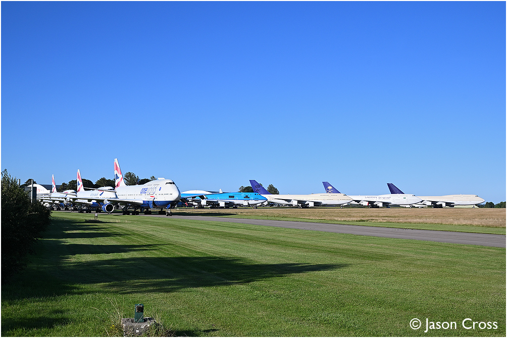 Cotswold Airport near Kemble where several disused Boeing 747s can be seen, G-CIVL, G-CIVJ and G-CIVN on the left, with TF-AMG (ex KLF PH-BFG), TF-AAC, TF-AAH and TF-AAD in the background. Date: 30 August 2020 Manipulation Notes: None
