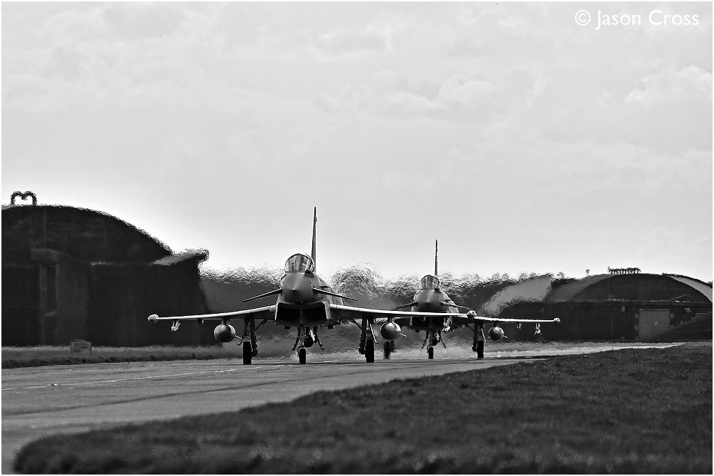 Eurofighter Typhoons ZK357 and another unidentified Typhoon make their way out to the runway at RAF Coningsby. Date: 3 September 2020 Manipulation Notes: None