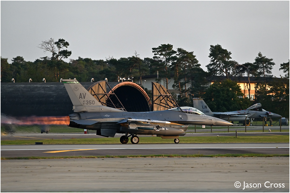 USAF F16 87-0350 blasts down the runway as it takes off from RAF Lakenheath. Date: 22 September 2020 Manipulation Notes: None