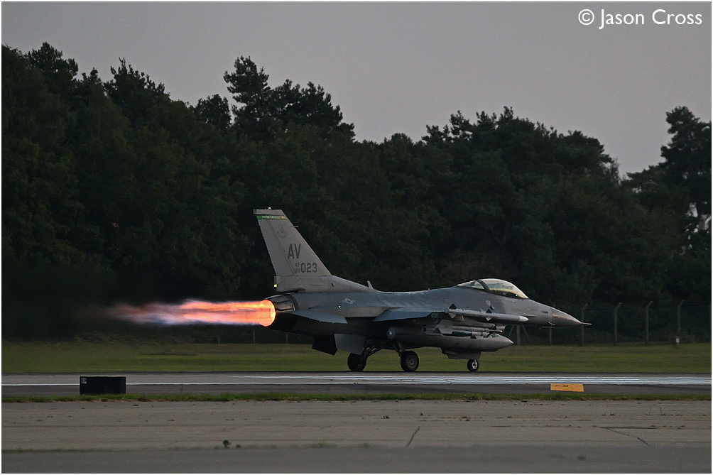 USAF F16 89-2023 blasts down the runway as it takes off from RAF Lakenheath. Date: 22 September 2020 Manipulation Notes: None