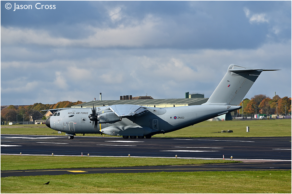 Airbus A400M 'Atlas' ZM403 taxiing onto the runway at RAF Brize Norton with a flight for Gdansk (callsign ASCOT4990). Date: 11 October 2020 Manipulation Notes: None