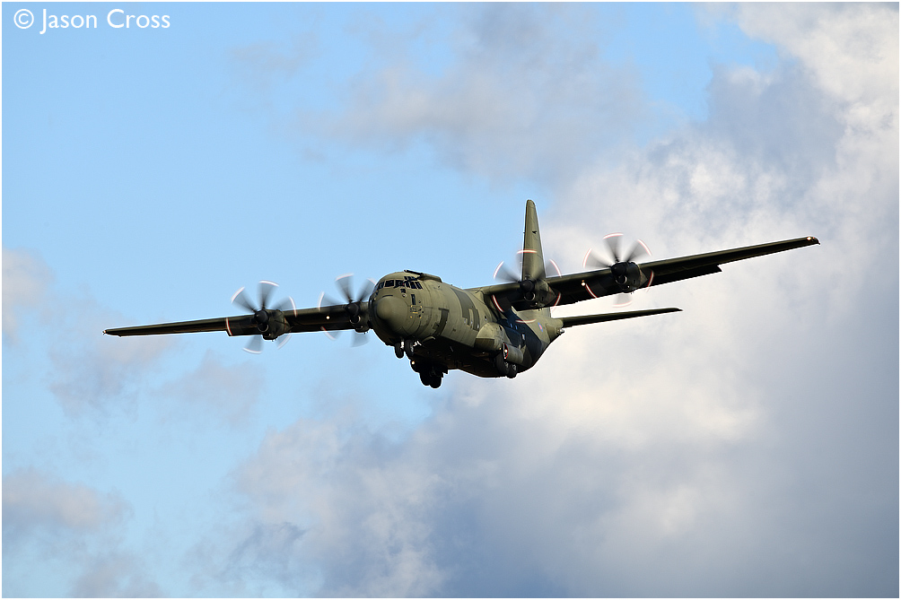 Lockheed C130J 'Hercules' ZH875 on final approach to RAF Brize Norton with a flight from Chania in Greece.