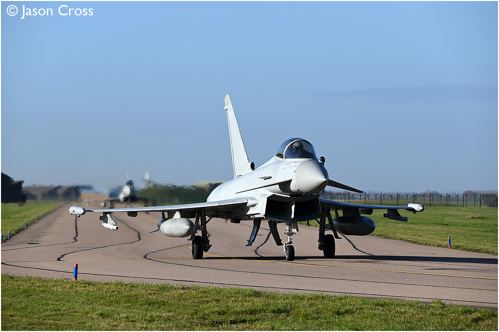 Typhoon FGR4s ZK357 and ZK325 on taxiway bravo at RAF Coningsby. Date: 4 November 2020 Manipulation Notes: None