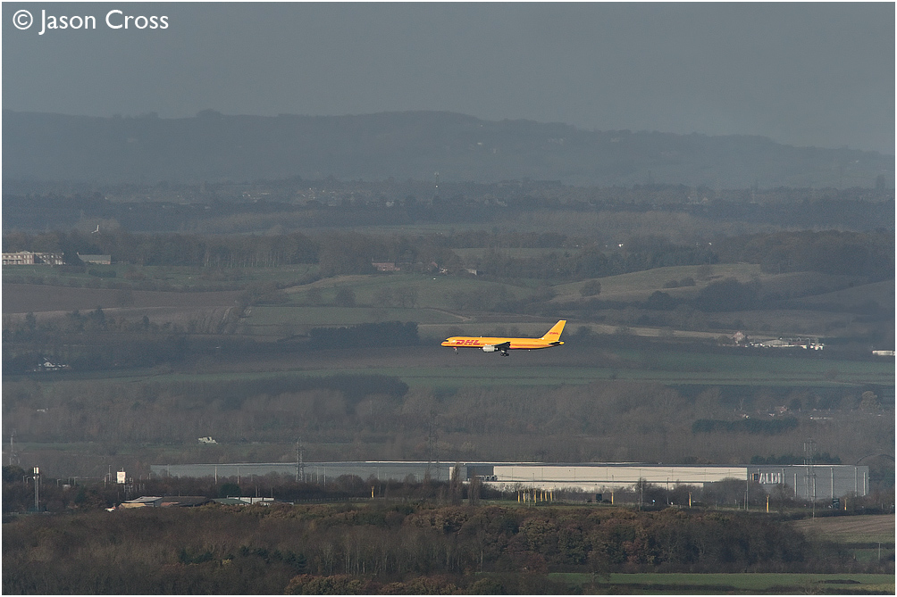 DHL Boeing 757 G-DHKD approaches East Midlands Airport with a cargo flight from Leipzig. Photo taken from Beacon Hill. Date: 15 November 2020 Manipulation Notes: None