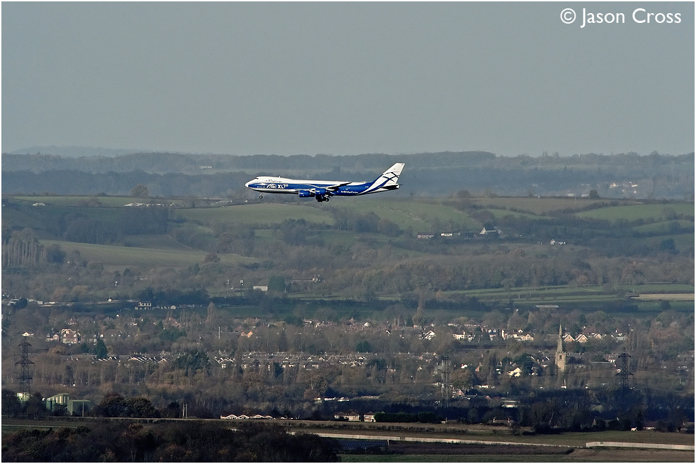 AirBridge Cargo Boeing 747 VP-BBY approaches runway 27 at East Midlands Airport and passes over Kegworth with a cargo flight from Krasnoyarsk in Russia. Photo taken from Beacon Hill. Date: 15 November 2020 Manipulation Notes: None
