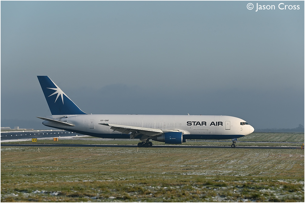 Star Air Boeing 767 OY-SRF shortly after landing at East Midlands Airport with a cargo flight from Cologne. Date: 31 December 2020 Manipulation Notes: None