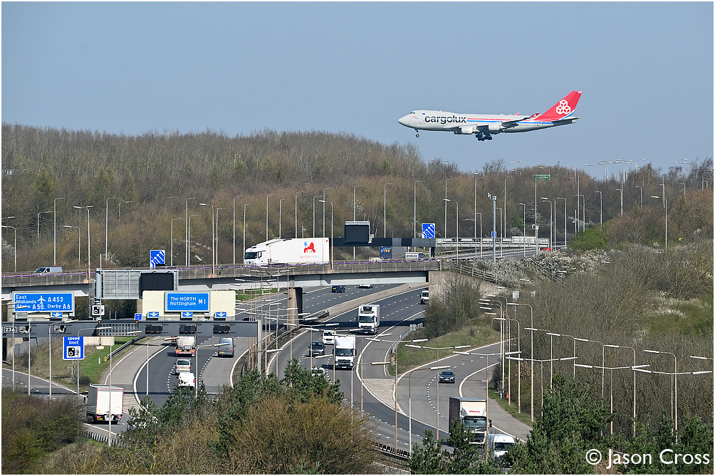Cargolux Boeing 747 LX-MCL on final approach to East Midlands Airport with a Formula 1 charter flight from Bahrain. The M1 / A42 junction dominates the foreground. Date: 30 March 2021 Manipulation Notes: None