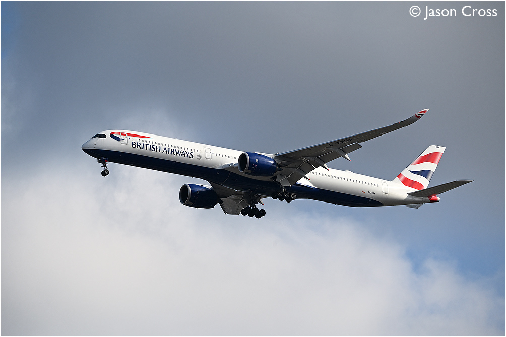 British Airways Airbus A350 G-XWBA. Over Hounslow on appaorach to Heathrow Airport runway 27R. Flight BA208, 2045 Miami to London Heathrow. Date: 11 April 2021 Manipulation Notes: None