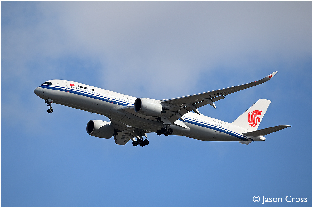Air China Airbus A350 B-308C. Over Hounslow on appaorach to Heathrow Airport runway 27R. Flight CA579, Beijing to London Heathrow. Date: 11 April 2021 Manipulation Notes: None