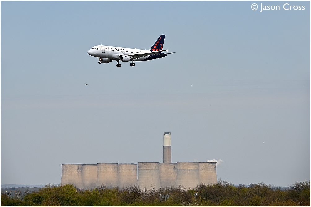 Former Brussels Airlines Airbus A319 2-SSIA on approach to East Midlands Airport runway 27 with an empty flight from Zagreb. It was destined for the paint shop at EMA. Date: 18 April 2021 Manipulation Notes: None