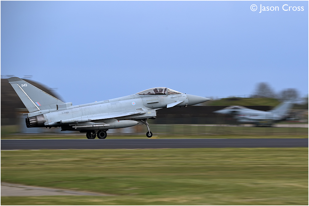 Pan shot of Typhoon FGR4 ZJ949 landing at RAF Coningsby. Date: 29 April 2021 Manipulation Notes: None