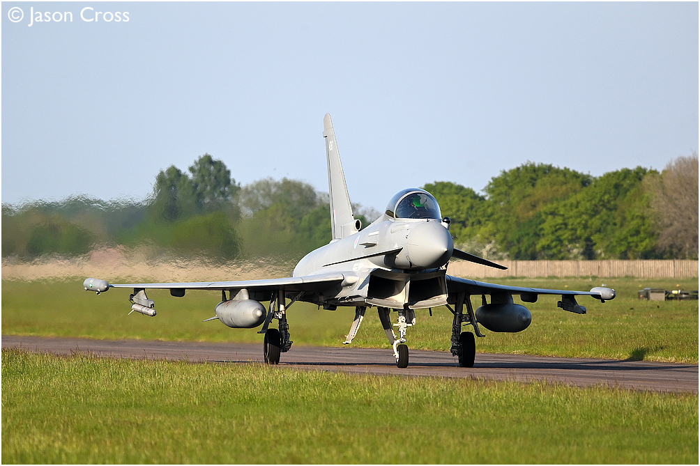After landing, Typhoon FGR4 ZK436 makes its way along taxiway alpha.