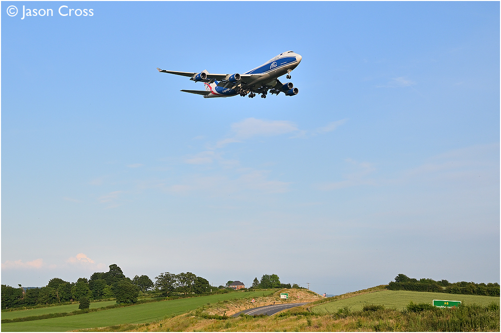 CargoLogicAir Boeing 747 G-CLBA passes over the Kegworth bypass on approach to East Midlands Airport runway 27 with a cargo flight from Cincinnati. Date: 2 July 2021 Manipulation Notes: None