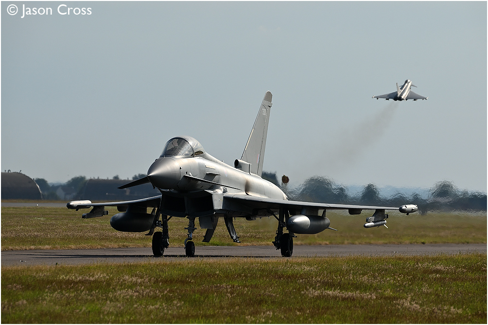 Typhoon FGR4 ZK300 on taxiway 'alpha' as ZK322 gets airborne in the background.