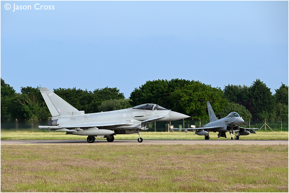 Typhoon FGR4 ZK367 sets off down the runway for take off and passes ZK328 which had pulled aside with a fault. RAF Coningsby. Date: 16 June 2021 Manipulation Notes: None