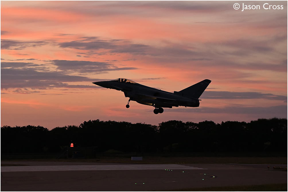 Typhoon FGR4 ZK300 approaches runway 25 for a 'touch and go' at sunset. RAF Coningsby. Date: 16 June 2021 Manipulation Notes: None