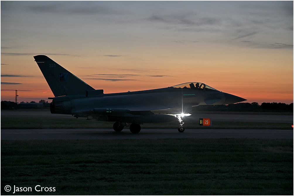As the sun sets, Typhoon FGR4 ZK333 holds at 'bravo 1'. RAF Coningsby. Date: 16 June 2021 Manipulation Notes: None