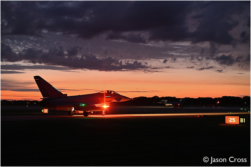 Typhoon FGR4 ZK335 waits at holding point 'bravo 1' while ZK328 sets off down the runway. RAF Coningsby. Date: 16 June 2021 Manipulation Notes: None