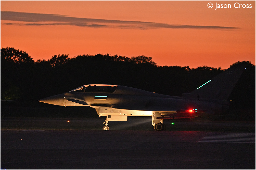 Typhoon T3 ZK380 waits for clearance to take off for a night sortie. RAF Coningsby. Date: 16 June 2021 Manipulation Notes: None