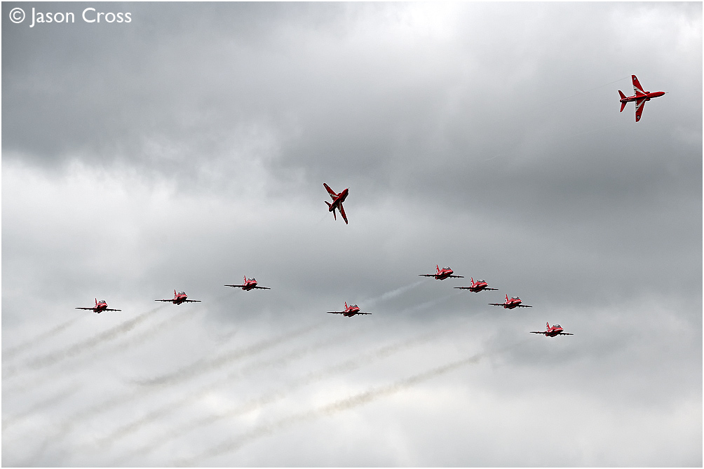 Red Arrows Hawk T1A jets do a run and break on arrival back at RAF Scampton from Farnborough. Date: 26 June 2021 Manipulation Notes: None