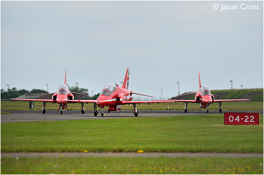 Red Arrows Hawk T1A jets taxi off the runway at RAF Scampton.