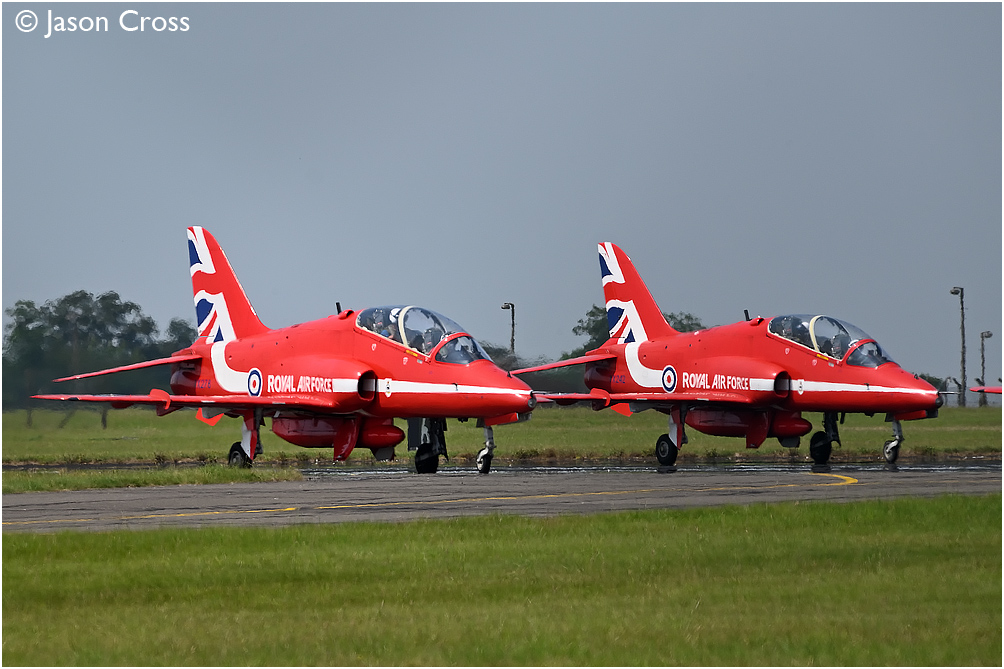 Red Arrows Hawk T1As XX278 and XX242 taxiing in after landing at RAF Scampton from RAF Lossiemouth. Date: 22 July 2021 Manipulation Notes: None