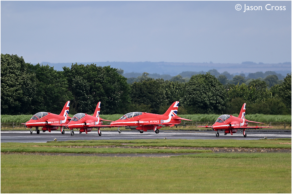 Red Arrows Hawk T1As XX278, XX219, XX319 and XX232 lining up on runway 22 at RAF Scampton. Transit move from RAF Scampton to Biggin Hill prior to performing a display over Folkestone. Date: 8 August 2021 Manipulation Notes: None