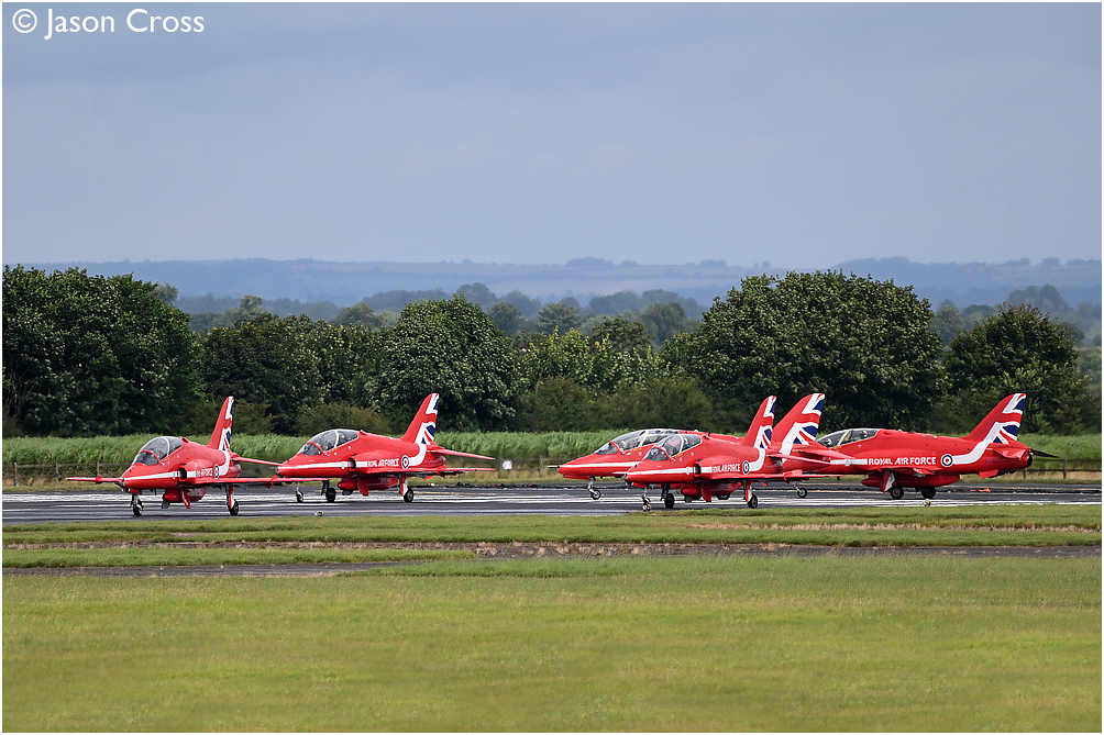 Red Arrows Hawk T1As XX232, XX325, XX319, XX310 and XX322 lining up on runway 22 at RAF Scampton. Transit move from RAF Scampton to Biggin Hill prior to performing a display over Folkestone. Date: 8 August 2021 Manipulation Notes: None