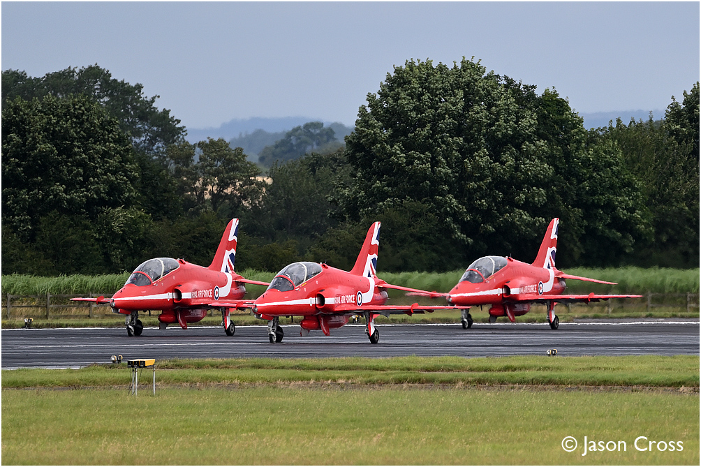 Red Arrows Hawk T1As XX278, XX219 and XX319 lining up on runway 22 at RAF Scampton. Transit move from RAF Scampton to Biggin Hill prior to performing a display over Folkestone. Date: 8 August 2021 Manipulation Notes: None
