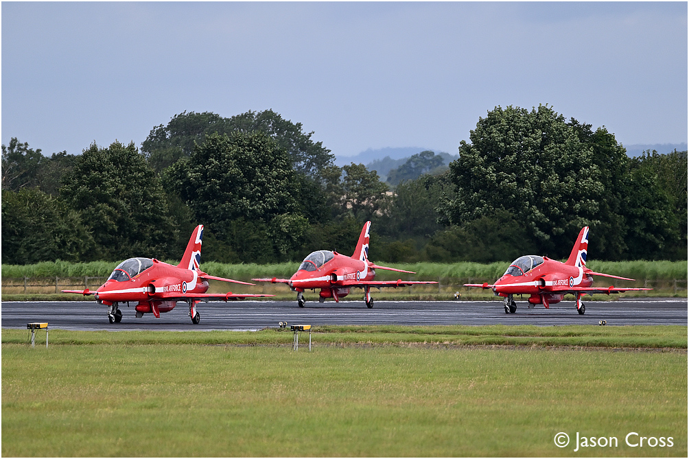 Red Arrows Hawk T1As XX232, XX319 and XX325 lining up on runway 22 at RAF Scampton. Transit move from RAF Scampton to Biggin Hill prior to performing a display over Folkestone. Date: 8 August 2021 Manipulation Notes: None