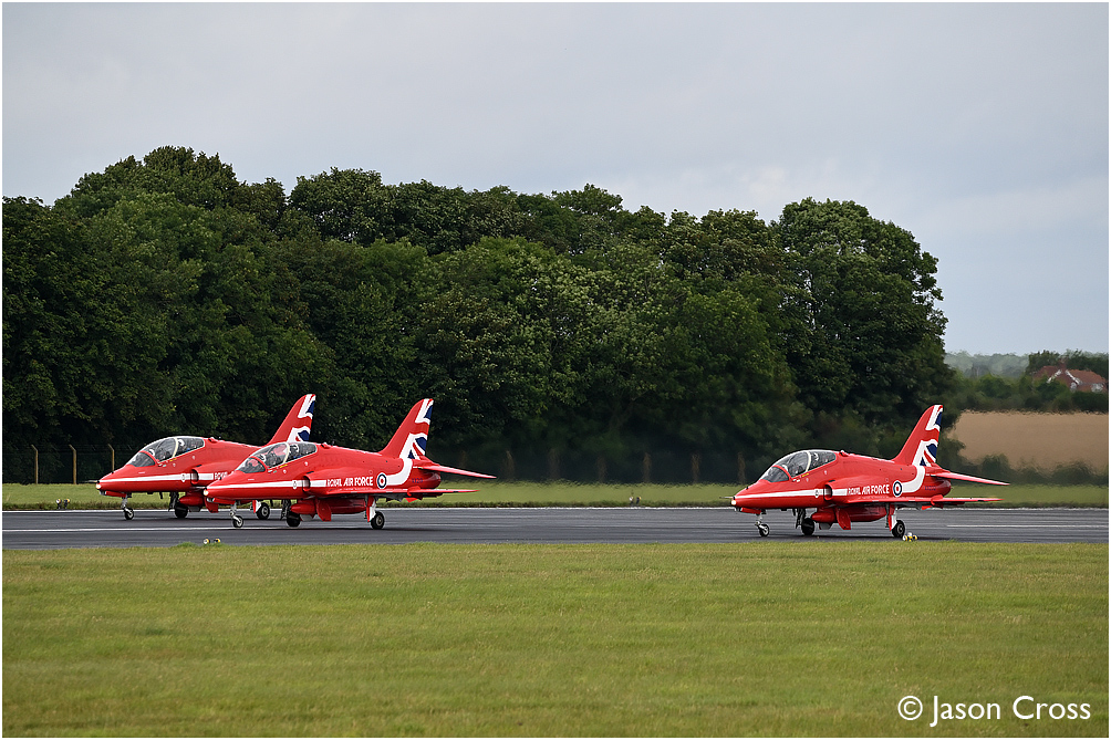 Red Arrows Hawk T1As XX278, XX219 and XX232 applying the power for take off on runway 22 at RAF Scampton. Transit move from RAF Scampton to Biggin Hill prior to performing a display over Folkestone. Date: 8 August 2021 Manipulation Notes: None