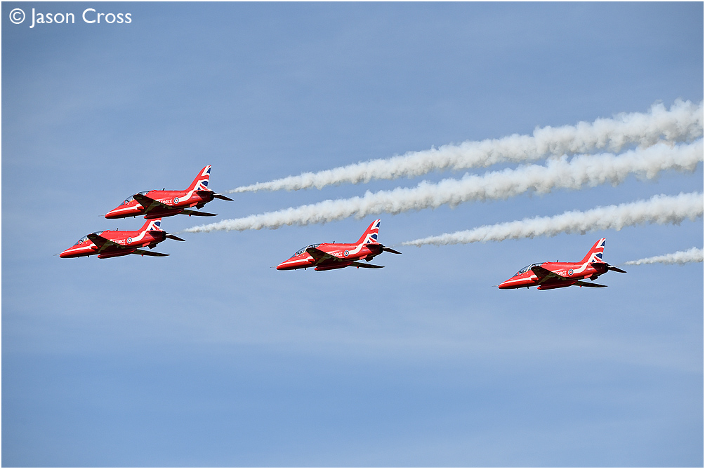 RAF Red Arrows Hawk T1As XX219, XX278, XX319 and XX232 in the circuit at RAF Shawbury at the end of a transit move from Exeter Airport. Date: 12 August 2021 Manipulation Notes: None