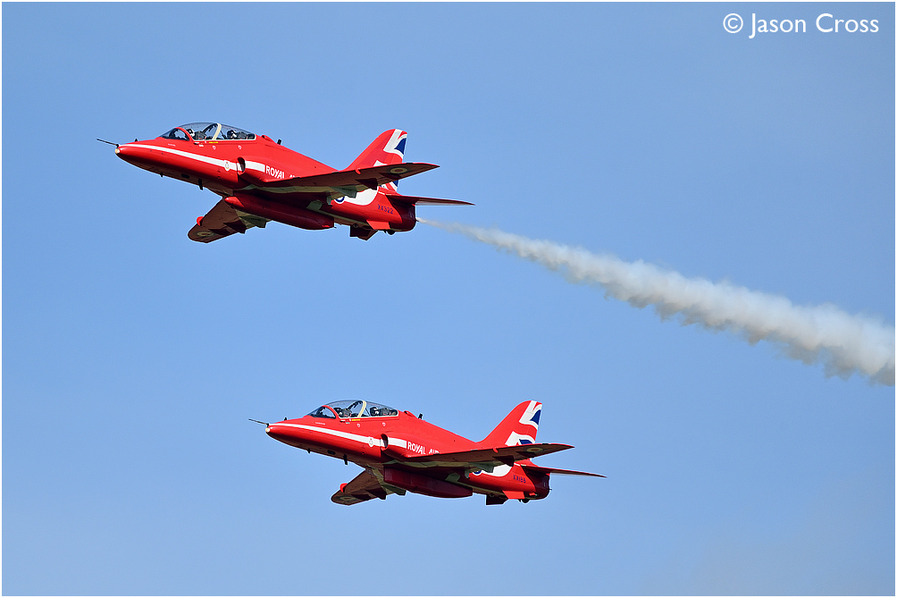 RAF Red Arrows Hawk T1As XX322 and XX188 in the circuit at RAF Shawbury at the end of a transit move from Exeter Airport. Date: 12 August 2021 Manipulation Notes: None