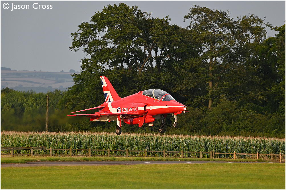 Red Arrows Hawk T1A XX325 on approach to runway 22 at RAF Scampton at the end of a transit flight from RAF Valley. Date: 12 August 2021 Manipulation Notes: None