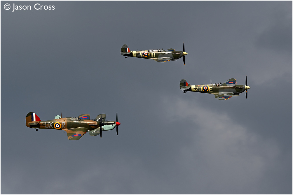 Spitfire MkIXb MH415, Spitfire MkIX ML407, Hurricane MkI P2902 and HA-1112-M4L Buchon 'Red 11'. The Victory Show 2021, Cosby, Leicestershire. Date: 4 September 2021 Manipulation Notes: None