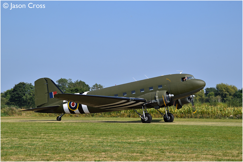 Douglas C47 Dakota KP220 taxiing to runway 01 at Cosby International Airport(!). The Victory Show 2021, Cosby, Leicestershire. Date: 5 September 2021 Manipulation Notes: None