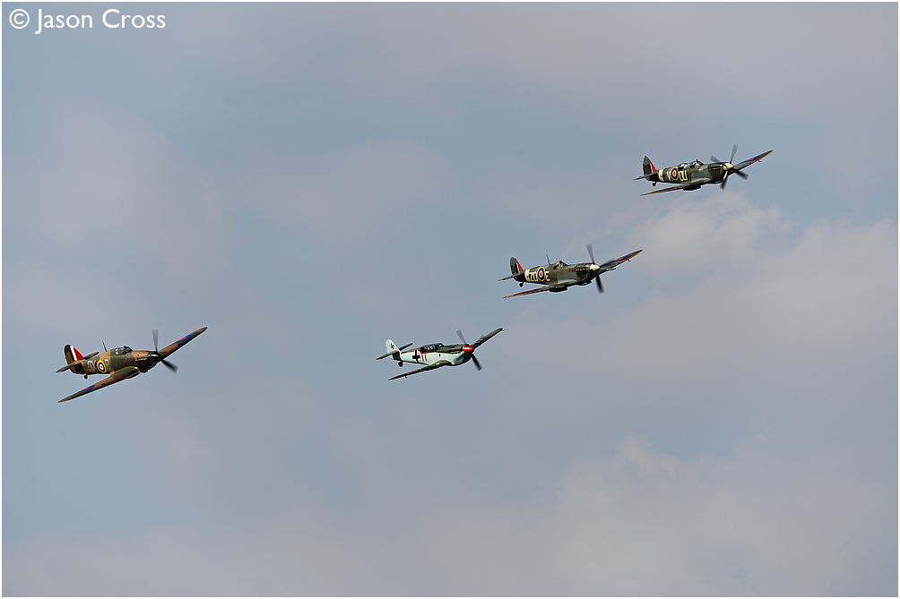 Hawker Hurricane MkI P2902, Hispano Buchon 'Red 11', Supermarine Spitfire MkIXb MH415 and Supermarine Spitfire MkIX ML407. The Victory Show 2021, Cosby, Leicestershire. Date: 5 September 2021 Manipulation Notes: None