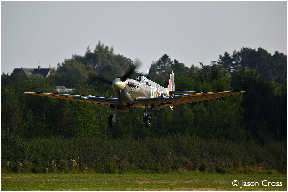 Supermarine Spitfire MkVc EE602 taking off using runway 01. The Victory Show 2021, Cosby, Leicestershire. Date: 5 September 2021 Manipulation Notes: None