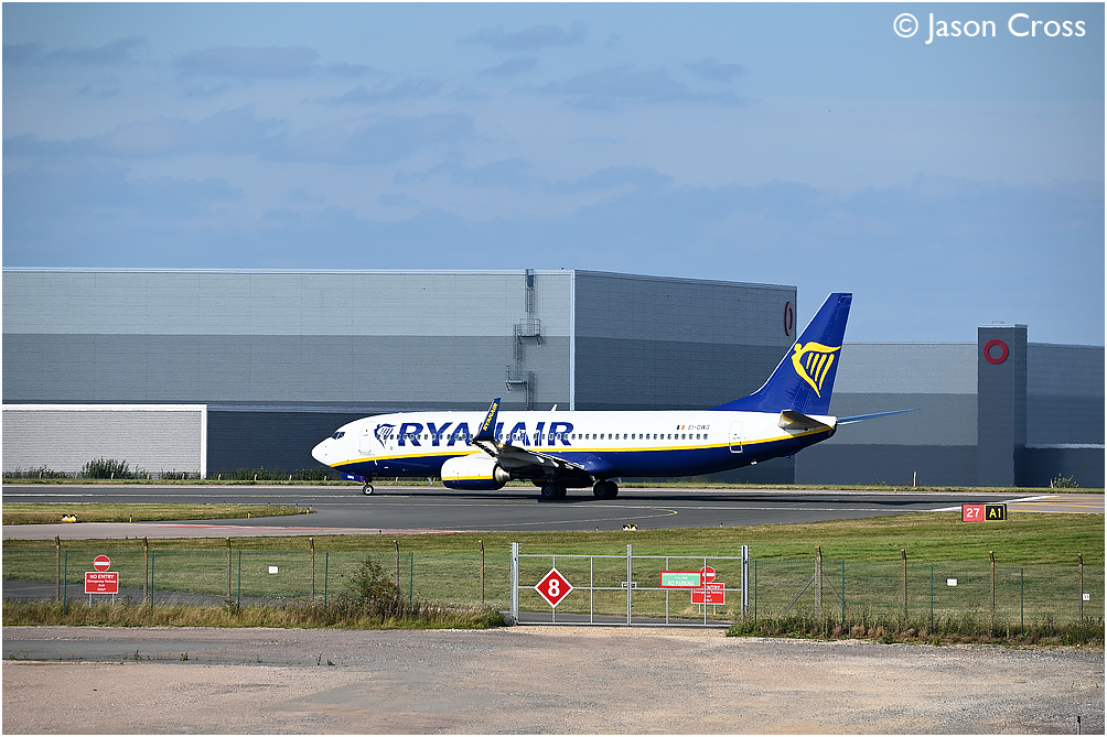 Ryanair Boeing 737 EI-DWG lines up to depart from East Midlands Airport with a training flight. Date: 22 September 2021 Manipulation Notes: None