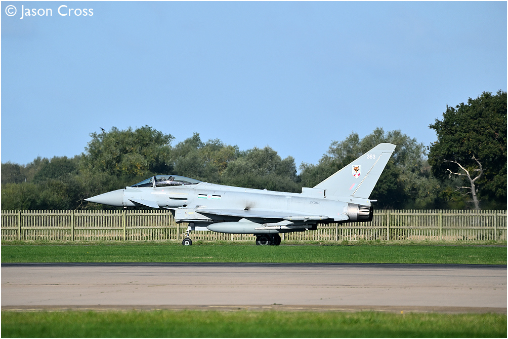 Typhoon ZK363 is seen making its way along taxiway alpha shortly after landing on runway 07 at RAF Coningsby. Date: October 2021 Manipulation Notes: None