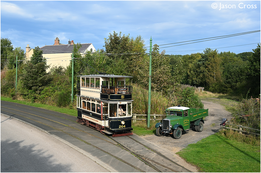 Sheffield 264 and a Leyland Cub tipper lorry. Beamish Open Air Museum. David Williams photo charter. Date: 17 September 2021 Manipulation Notes: None Camera mounted on a tall pole and remotely fired