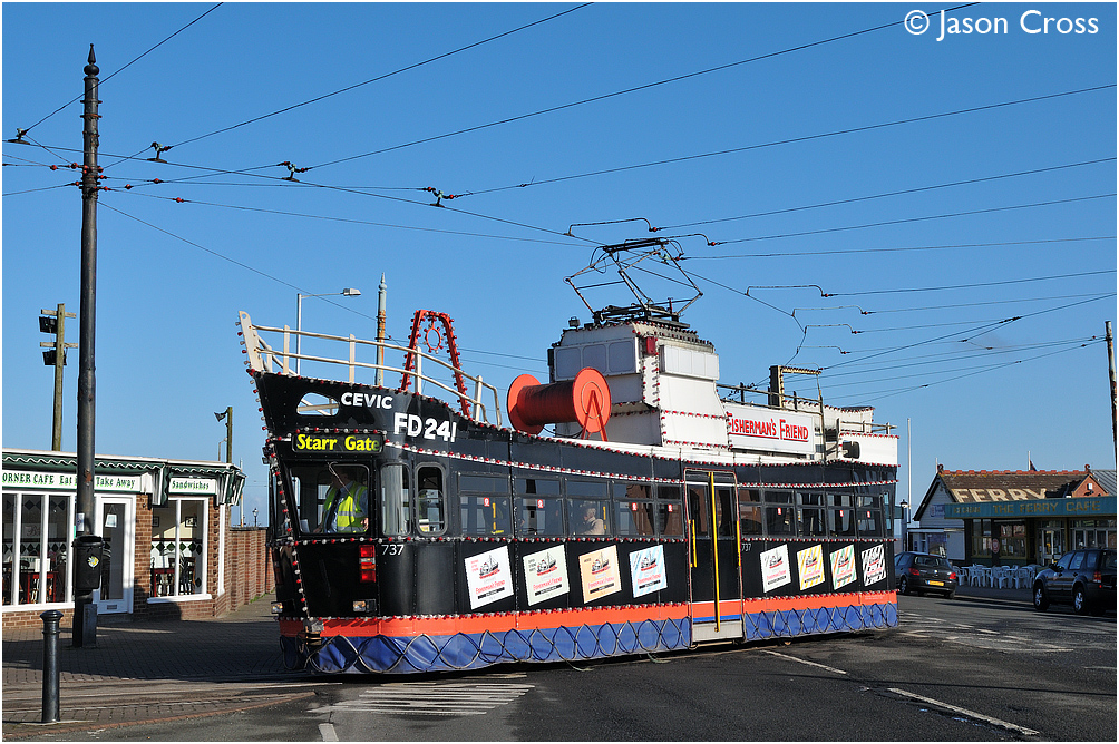 A shortage of available trams for the Easter weekend saw illuminated trawler tram 737 pushed into action on the Fleetwood service. It is seen departing from Fleetwood Ferry with the 0848 to Starr Gate. Date: 11 April 2009 Manipulation Notes: None